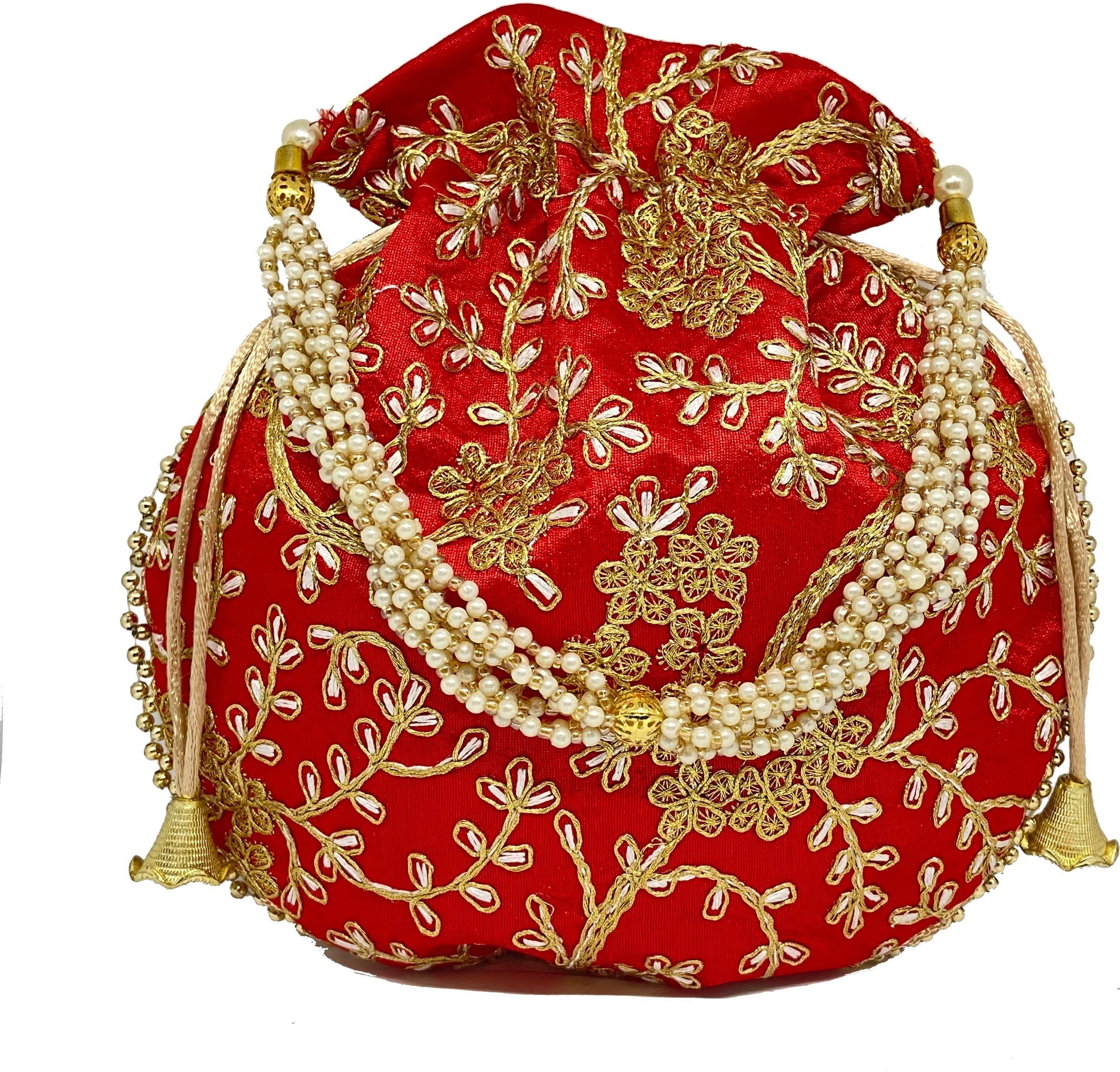Upgrade your wedding/ festival accessories more with this Gorgeous potli. This beautiful Potli or batwa bag having eye catchy premium embroidery row silk material. It has a braid string on the top for ease to carry. You can easily carry big mobile phone, valuables items, cosmetics, etc. as this potli having spacious compartment. This Potli bag having beautiful handle, made with high quality pearls which look awesome and easy to carry. Perfect Giveaways! Ideal for Wedding Gifts, Festive Gift, Valentine Gifts or any other occasions. To be use in casual routine wear as well as in party, wedding, etc. Please note that as all clutch, purse, potlis, etc. are handcrafted. Hence, slight variation in design, color, work pattern and shape may not be considered as defect.