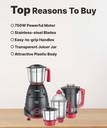 This juicer-mixer-grinder’s jars are furnished with easy-to-grip handles that help you carry them with ease. The ergonomically designed handles provide a comfortable grip, thereby minimising the risk of slippage.