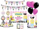 This 80 pieces package includes 6 Danglers, 10 Party Hats, 10 Thank you Cards, 1 Welcome Banner, 1 Bunting, 2 Centerpieces and 50 Balloons.