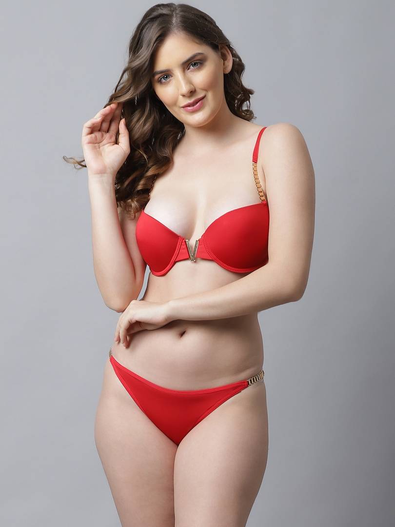 Thanks to its thoughtful design, this lingerie set features a beautiful buckle at the center and a stylish chain on the straps. With push-up cups for a gentle lift and underwired support, it provides a natural silhouette. The demi coverage cups and plunging neckline make it ideal for low-cut outfits, while seamless cups ensure a smooth finish under fitted tops.