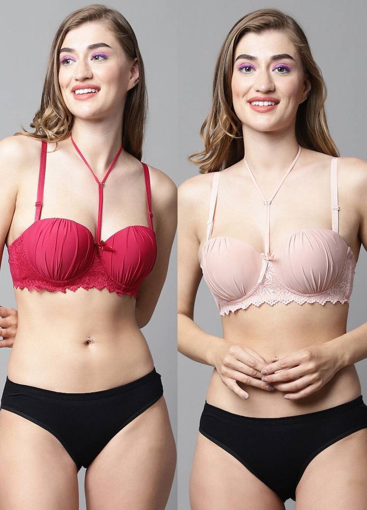 PrettyCat T-shirt bra with black panty for awasome look. Pushup padded cups to protect modesty. Crafted with exquisite self-patterned polyester & lace fabric. Underwired cups for a gentle lift. Wide set straps for broad neck outfits. Detachable straps to wear as a strapless bra or style in multiple ways. Cute bow at centre for embellishment. Triple hook & eye enclosures in bigger cups. Designed with cage-style at front. Dual strap on the back secured with hook & eye enclosures. Soft elastic at the waistband & leg openings for a snug fit. Double layered gusset for hygiene.