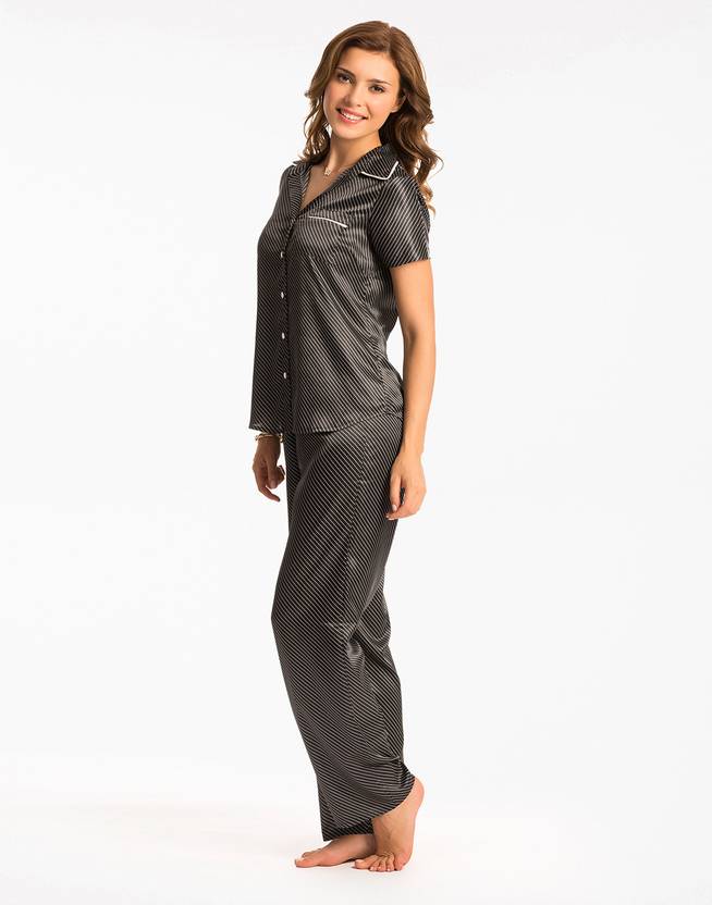 PRETTYSECRETS Women Top & Pyjama Set Black Striped
