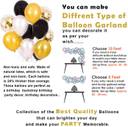 1pc black happy birthday banner, 20pcs golden metallic, 20pcs black metallic, 20pcs white metallic, 2pcs silver foil curtain, 5pcs golden confetti, 2pcs black star foil, 1pc hand balloon pump, 1pc glue dots and 1pc arch