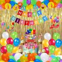 1Pc multicolour happy birthday paper bunting, 40Pcs multicolour metallic balloon, 1pc cake topper, 8pcs cup cake topper, 8pcs cardstock and 2pcs golden foil curtain