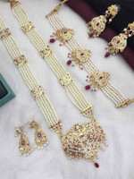 Crafted with meticulous precision, this jewellery set features an elegant and sublime design. The intricate arrangement of pearls and diamonds in this set, adorned with elusive motifs, exudes traditional charm and sophistication. With each piece designed with rich detail and sophistication, this jewellery set is sure to elevate your look for any special occasion, effortlessly capturing attention and admiration wherever you go.