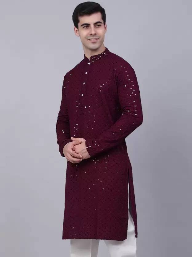 Princejan Men Chikan Embroidery Straight Kurta (Maroon)