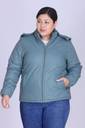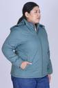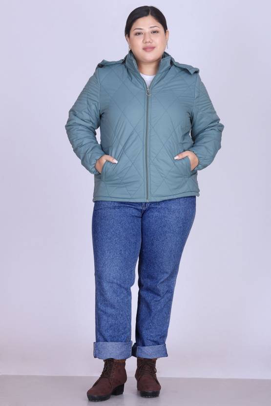The jacket has a Stand collar and a front zipper closure Plus size .