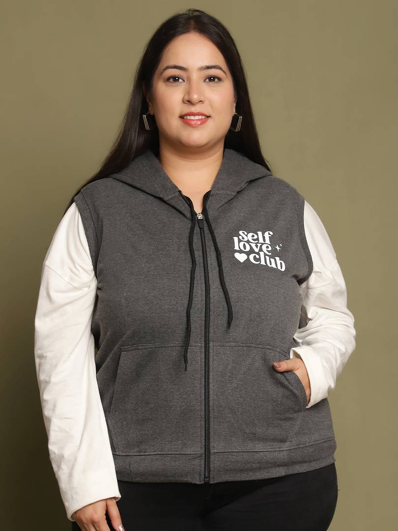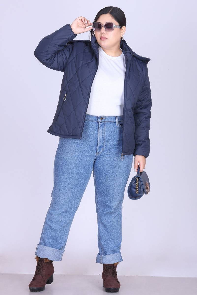The jacket has a Stand collar and a front zipper closure Plus size .