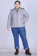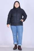 The jacket has a Stand collar and a front zipper closure Plus size .