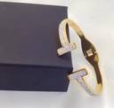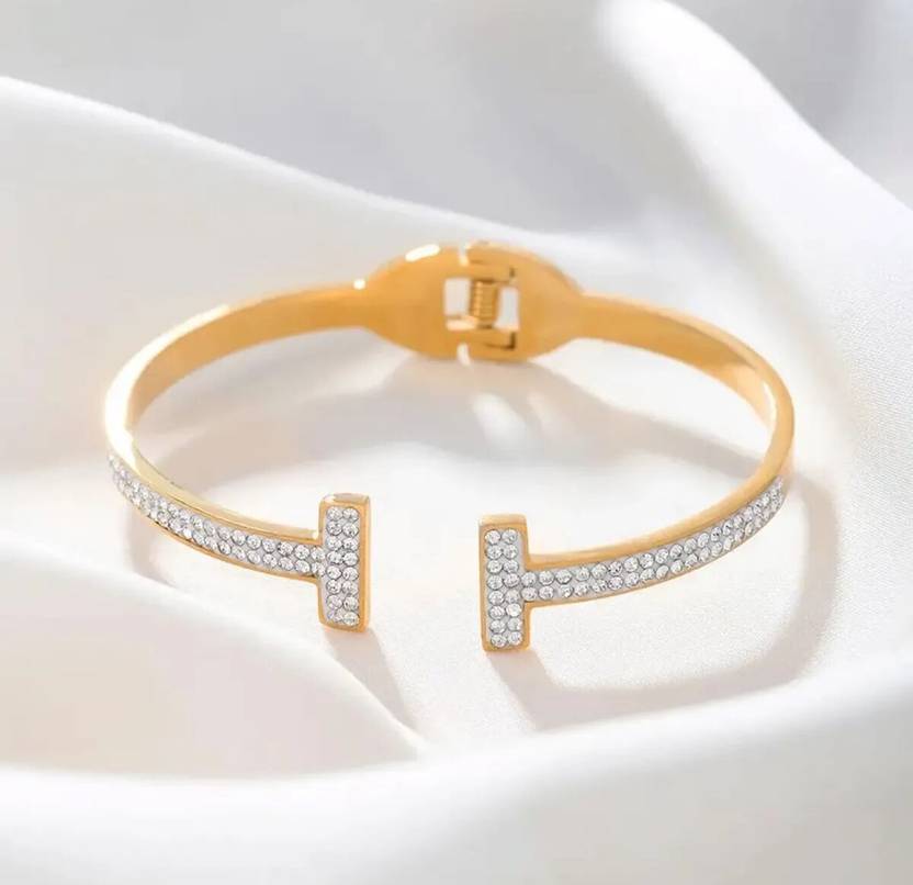 CONSTRUCTION: Open cuff design with crystal-studded T-shaped endings, secured by a durable spring mechanism