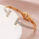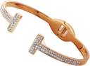 Make a stunning style statement with this elegant rose gold-plated cuff bracelet featuring a unique double 'T' design. The bracelet is beautifully adorned with sparkling crystal studs that catch and reflect light from every angle, creating a mesmerising effect. The adjustable spring clasp mechanism ensures a comfortable, secure fit for various wrist sizes. The sophisticated combination of rose gold plating and crystal embellishments makes this piece versatile enough to complement both casual and formal attire. Perfect for adding a touch of glamour to any outfit, this bracelet can be worn alone as a statement piece or stacked with other bracelets for a more dramatic look. The durable construction and quality finishing make it suitable for regular wear while maintaining its lustrous appearance.