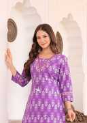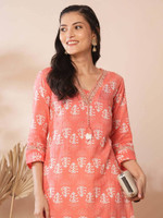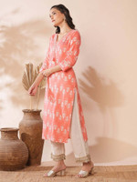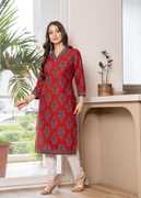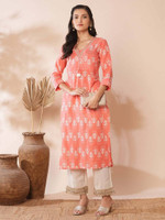 Offering a nature-inspired pattern, this women's kurta is decorated with delicate motifs that resemble tree forms. The design is scattered evenly across the fabric, creating a sense of rhythm. Moreover, the print draws from natural elements, offering a composed and grounded visual tone. Its presence enhances the surface without overwhelming the overall simplicity of this garment.