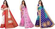 This pack of 3 sarees from Priyashi is suitable for all ocassions. The sarees will look trendy as casual party wear, festive wear and also on religious ceremonies. These sarees are perfect for wedding ocassion and also give a formal look perfect for office wear. They can be paired with any matching or contrast blouse and can be draped in variety of ways. Both the sarees give a great feel as they are made of soft fabric, and come with matching blouse material that can be customised as per requirement. Women can wear this sarees combo to look stylish.
