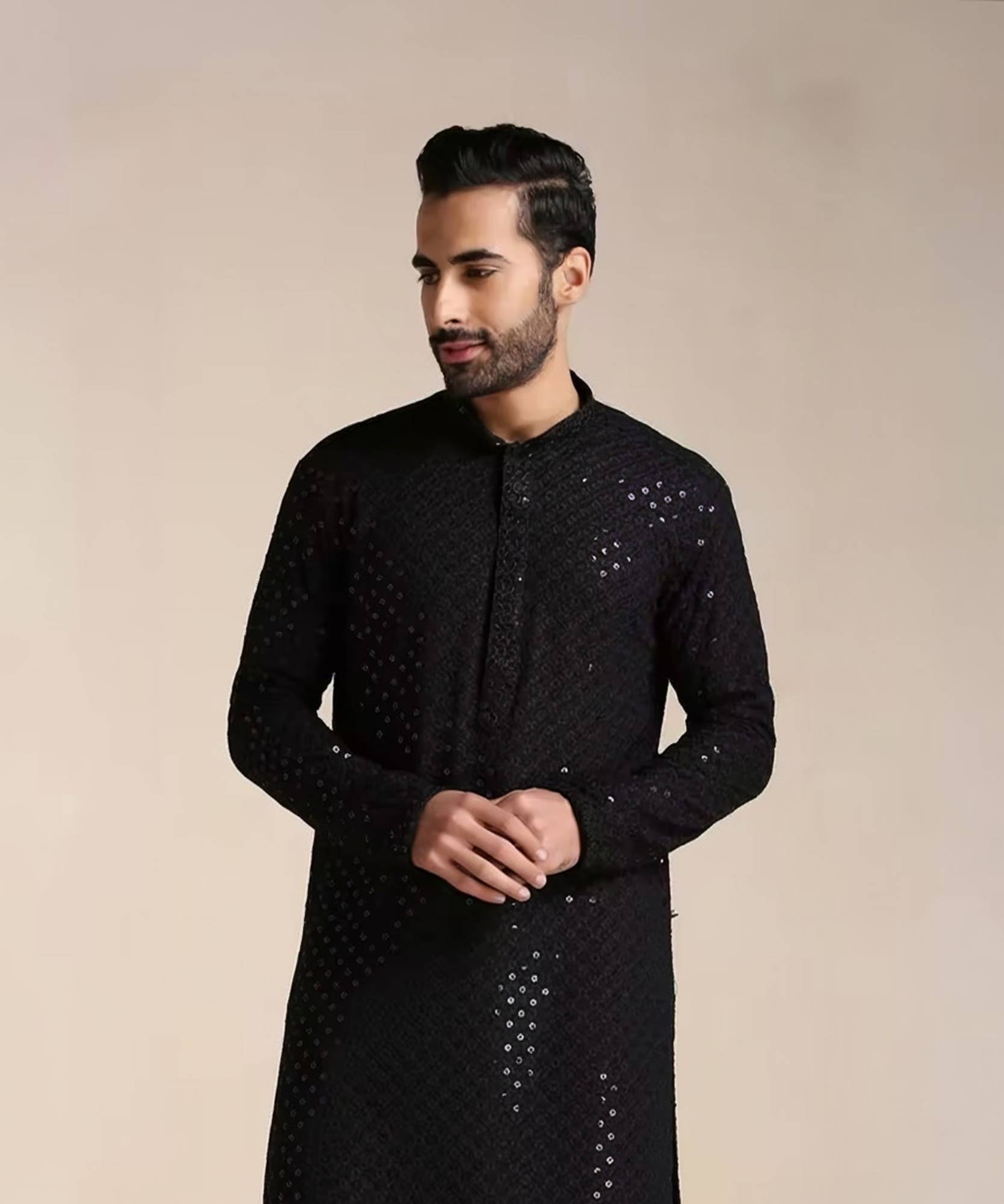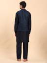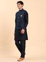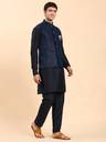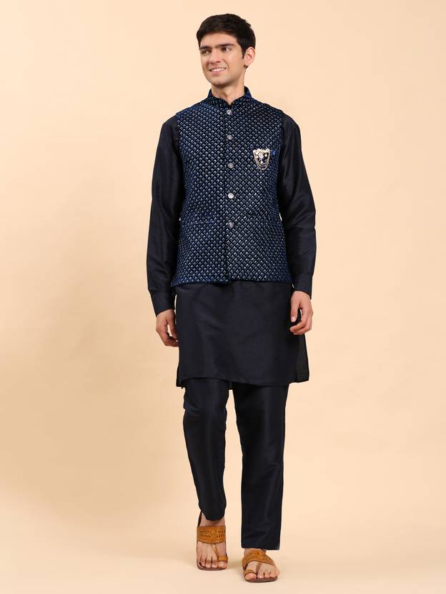 Pro-Ethic heavy cotton kurta paired with a velvet Nehru jacket is the epitome of refined craftsmanship and modern sophistication. The kurta, crafted from premium, dense cotton fabric, ensures both comfort and durability, offering a structured yet breathable fit for any occasion. Its rich texture and vibrant color are designed to stay fresh and well-fitted over time, providing a perfect balance of traditional elegance and ease. The velvet Nehru jacket, enhanced with intricate embroidery and sparkling sequins in star-like patterns, adds a luxurious touch to the ensemble. The fine detailing and soft velvet fabric create a sharp, sophisticated look, while the shimmering sequins bring a touch of glamour and craftsmanship. Completing the look is a pair of tailored pants, designed to offer both comfort and practicality. Featuring two side pockets, these pants add a contemporary touch while maintaining a sleek silhouette. The pants perfectly complement the kurta and Nehru jacket, creating a refined, polished appearance that is versatile for various occasions. Ideal for weddings, festivals, and family gatherings, this set is designed to make a statement. The combination of the heavy cotton kurta, sequined velvet Nehru jacket, and well-fitted pants is a versatile addition to your wardrobe, offering both comfort and luxury, making it perfect for those who appreciate timeless style and modern flair.