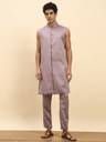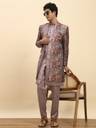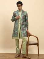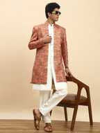 Upgrade your ethnic wardrobe with this stylish Indo-Western set, designed to blend traditional elegance with modern sophistication. Crafted from premium fabric, the outfit features a finely detailed kurta paired with matching trousers for a sleek and regal look. Perfect for weddings, festive occasions, receptions, and cultural events, this ensemble ensures you stand out with class and confidence. The contemporary cut and intricate design make it a versatile choice for men who appreciate timeless fashion with a modern twist.