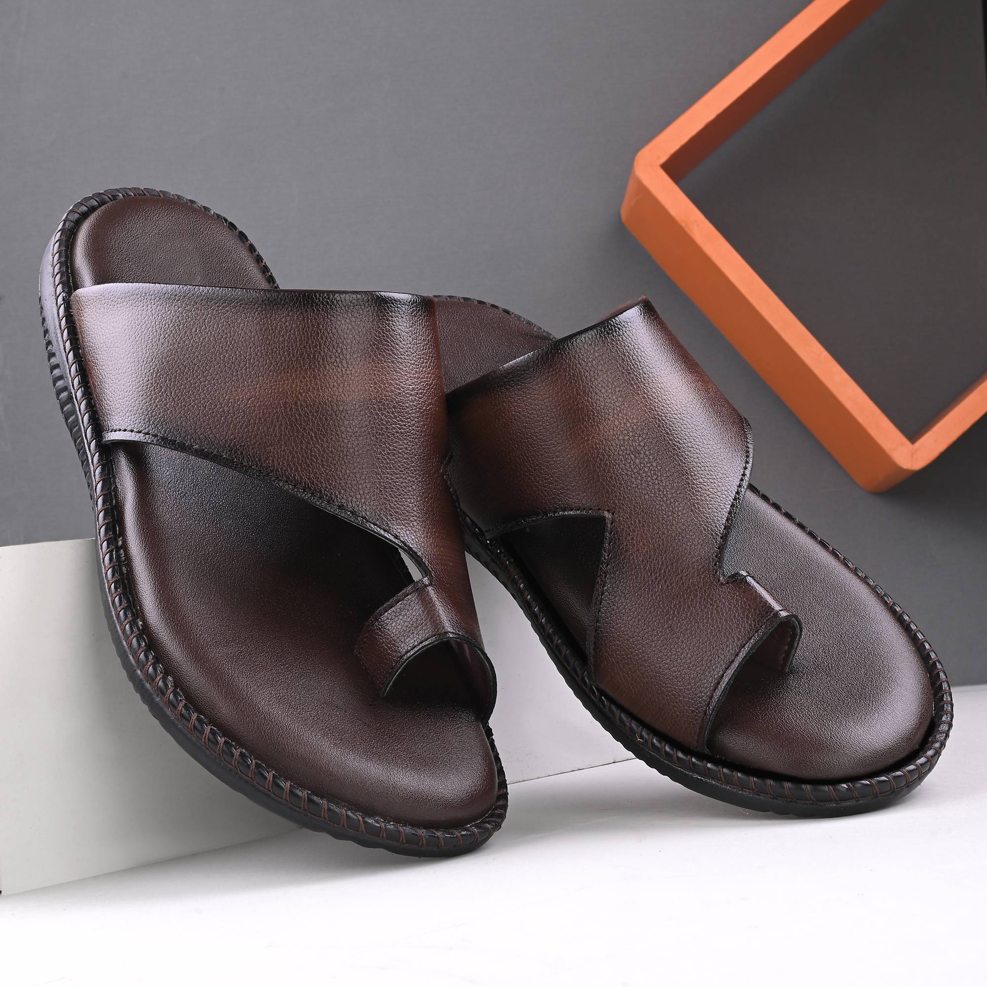 These men's sandals are crafted from rich brown leather, featuring a classic thong design with a comfortable toe post and a broad strap across the foot. The leather upper has a subtle textured finish, and the dark sole is accented with visible stitching for a refined look. Designed for comfort and durability, these flat sandals are perfect for everyday wear. They can be effortlessly paired with casual outfits such as jeans, shorts, chinos, or linen trousers.