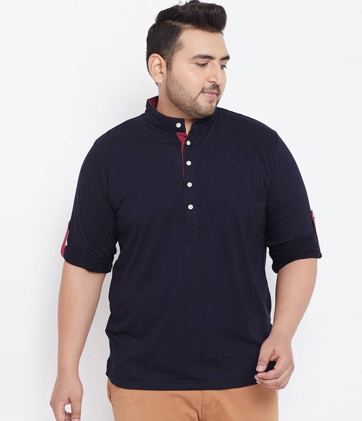 bigbanana Solid Men Mandarin Collar Dark Blue T-Shirt