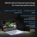 To keep your laptop cool in all situations, the ASUS Ice-cool Thermal technology in Vivobook 16X uses upgraded 8 mm and 6 mm heat pipes, and an IceBlade fan that efficiently accelerates heat transfer. The 89-blade fan and impeller are made of a liquid-crystal polymer, which means they’re lighter and thinner than ordinary fans. This helps the Intel Core CPU and NVIDIA GPU to operate comfortably at up to a blistering 55 W combined TDP4 in Performance mode, with no throttling.