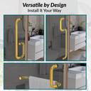 Functions as a sturdy door handle and a practical towel holder, optimizing space and convenience. Constructed from high-grade stainless steel for long-lasting durability and resistance to rust and corrosion. Features a luxurious PVD Gold coating that adds sophistication and modern style to your bathroom. Suitable for most glass shower and bath doors, ensuring a secure and stylish fit. Comes with all necessary hardware for quick and hassle-free setup.Designed for a comfortable and secure grip while operating the door. Combines two essential functions into one sleek and compact design. Easy to clean and maintain, retaining its shine and elegance for years to come.