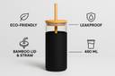 | Key Features | - Eco-Friendly & Reusable: Made from high-quality borosilicate glass with a sustainable bamboo lid – a perfect alternative to plastic cups., Leakproof Design: Secure silicone seal ensures zero leakage, making it ideal for travel and everyday use., Durable Glass Body: Thick, shatter-resistant glass suitable for both hot and cold beverages., Includes Straw & Lid: Comes with a reusable glass straw and tight-fit bamboo lid for convenient sipping on the go., Easy to Clean: Wide-mouth opening for easy cleaning and refilling – dishwasher safe (glass only)., Stylish & Minimalist: Sleek, modern design perfect for home, office, gym, or outdoor use., Multi-Purpose Use: Ideal for smoothies, iced coffee, juices, tea, protein shakes, and more.