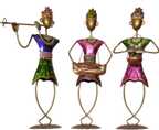 Transform your living space with these exquisite handcrafted decorative Shri Krishna musician figurines. This charming metallic sculptures features musicians in traditional Indian attire, each uniquely posed and intricately detailed. Standing approximately 46 cm tall, these artistic pieces showcase vibrant colours including royal purple, pink, and emerald green, adorned with delicate golden patterns. The first figurine plays a flute, while the others strike graceful poses, creating a harmonious ensemble. Each sculpture boasts meticulous craftsmanship with ornate details on the clothing, decorative headpieces with leaf motifs, and perfectly balanced proportions. These versatile decor pieces can serve as striking centrepieces, shelf accents, or mantelpiece decorations. The durable metal construction ensures longevity, while the artistic finishing gives them an antique, timeless appeal. Perfect for adding a touch of cultural elegance to any room, these figurines make thoughtful gifts for art enthusiasts and collectors alike.