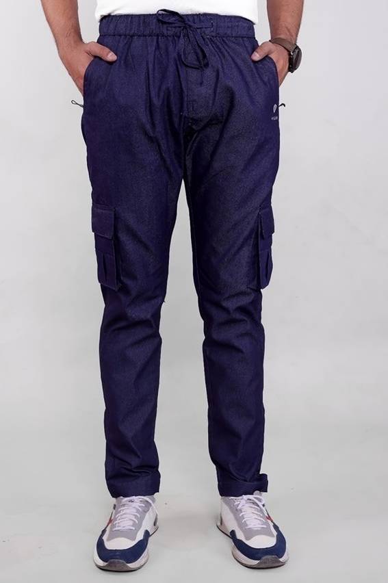 Stylish and Trendy blue cargo jwith an elasticized waistband, drawstring closure, slim fit, mid-rise, and regular length.