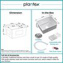 Plantex kitchen sink is made of high-quality 304-grade stainless steel, which provides exceptional strength and long-lasting functionality. In addition to providing a sleek appearance, its silver matt surface guarantees outstanding resistance to rust, stains, and scratches. For optimal capacity and usability, the 21x18-inch single bowl has an offset drain and deep, tight corners. Large pots, pans, and dishes are ideal for washing in the deep basin since it reduces splashing and makes cleaning large objects simple.This undermount sink's clever design makes the most of your kitchen's space. Ideal for compact kitchens, its single bowl and streamlined form free up important countertop space, improving the efficiency of meal prep and cleaning. It is ideal for both traditional and modern kitchens, and it goes well with any type of décor. Whether you're remodeling your kitchen or installing a new one, this undermount sink's elegant, classic style will improve its appearance. The package includes 1 piece of kitchen sink, 1 piece of round coupling and hose pipe. Made in India and the overall dimensions of under mount sink for kitchen (l) 53 x (w) 46 (h) 23 cm.