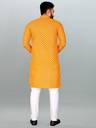 This set's straight-fit kurta allows comfortable movement during long hours of wear. The Mandarin collar introduces a clean neckline, helping the kurta appear neatly framed. Moreover, long sleeves provide full coverage, which supports comfort across different settings. A button closure offers simple fastening, making dressing and removal straightforward. Furthermore, the side slits improve ease while walking or sitting, supporting everyday comfort. The thigh-length cut maintains traditional proportions, while straight-fit pyjama pants ensure consistency in comfort and appearance.