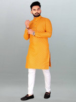 You will notice small, evenly spaced diamond-shaped motifs arranged in a repeating grid, giving this men’s kurta a refined visual rhythm. The repeated pattern adds gentle detail, helping this kurta look expressive without appearing loud. Because the motifs are evenly aligned, the surface feels orderly and composed. A solid pattern on the pyjama balances the overall look, allowing the kurta design to remain the focal point.