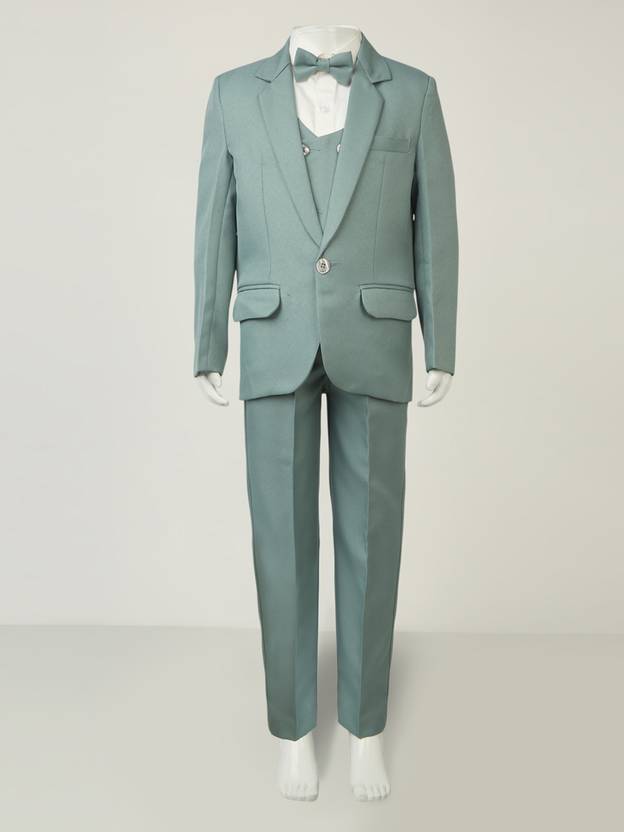 Add a refreshing touch of elegance with this Sea Green Solid Suit Set. Featuring a full-sleeve blazer, shirt, pants, waistcoat, and a charming bow tie, this outfit is perfect for creating a regal look for weddings, parties, and special occasions!