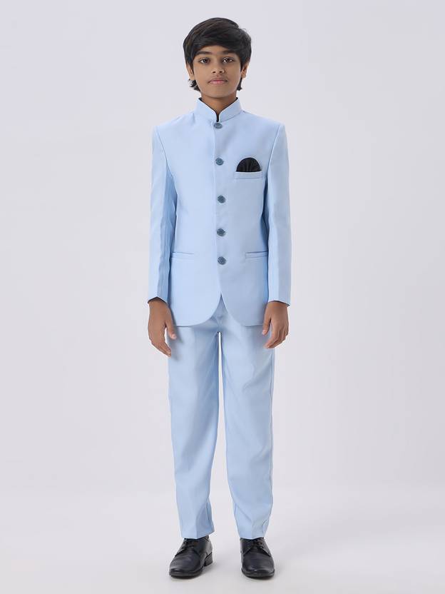 This classic Sky Blue 2-piece Jodhpuri set combines traditional elegance with a modern fit. The set includes a finely crafted Jodhpuri jacket and matching trousers, perfect for weddings, festivals, or cultural celebrations. The timeless Sky Blue color offers sophistication, while the tailored design ensures your little one looks sharp and stylish for any formal ethnic occasion.