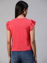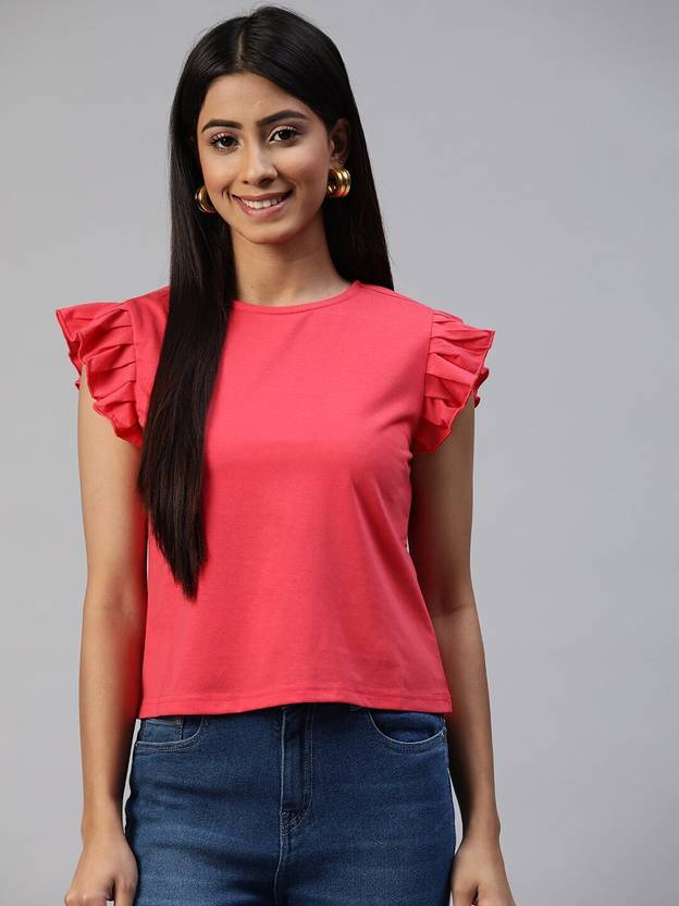 Fuchsia Tshirt for women Solid Regular length Round neck Short, flutter sleeves Knitted cotton fabric