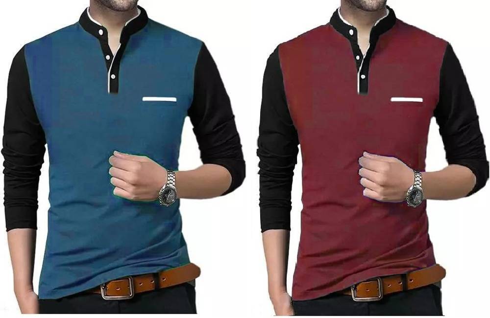 PSDESIGN Solid Men Mandarin Collar Blue, Maroon T-Shirt