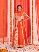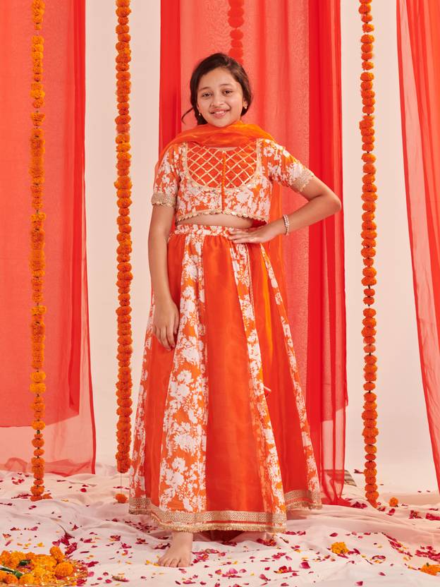 This Bright, Breathable And Beautiful Lehenga Set Shall Definitely Be Her Go-To Ethnic Pick For Any Festive Occassion. The Flared Lehenga And Choli Are Made In Slik, Adorned With Ornamental Laces. The Relaxed Silhouette And Natural Material Ensure Utmost Comfort For The Little One, So The Best Smile Is Always On.