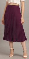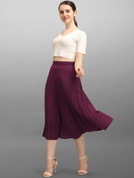 This pleated midi skirt is the trendiest item of the season. Every Bollywood celebrity has been seen styling this skirt. The skirt works for all body types as the pleats expand and contract as per the shape of the body. Elasticated wide back waistband which has a very slimming effect on the midsection (tummy/waist). The length of the skirt is perfect for the average Indian woman's height. Below the knee length has a lengthening effect on the body.The premium crepe fabric looks extremely rich and is wrinkle-free thus making it travel friendly