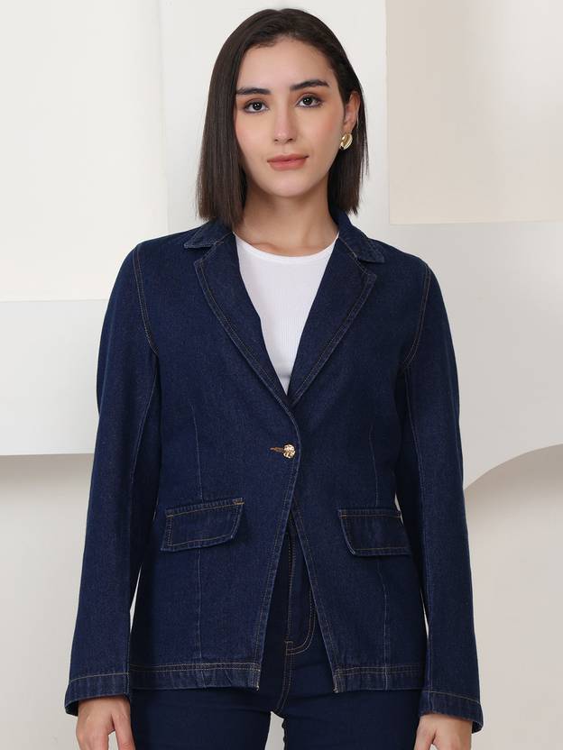 PUELLA Women’s Dark Blue Denim Blazer, a perfect blend of chic sophistication and everyday comfort. Tailored from premium stretch denim, this blazer adds structure without compromising on ease. The classic lapel collar, single gold button closure, and flap pockets lend it a polished edge — ideal for brunches, office casuals, or evening outings.