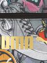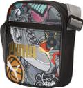 Zip opening into main compartment, zip pocket with PUMA branded reverse zipper on front, zip pocket inside, 150D Polyester lining with PU backing, adjustable webbing shoulder strap with plastic hardware, colored metal zip pullers with red string, PUMA No. 2 Logo printed on front.