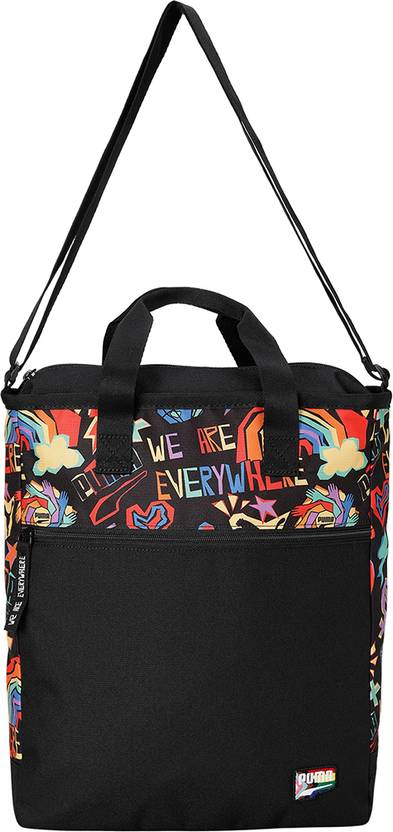 PRODUCT STORY : FEATURES & BENEFITS : DETAILS : Zip opening into main compartment.Adjustable webbing shoulder strap with plastic hardware.Short webbing carry handles.Durabase material on bottom panel.Large zip pocket on front.Lining slip-in pocket inside.Internal organiser inside.Webbing tape zip puller with 'We Are Everywhere' print.Colourful 'We Are Everywhere' all-over print.PUMA Wordmark and Formstrip badge on front.