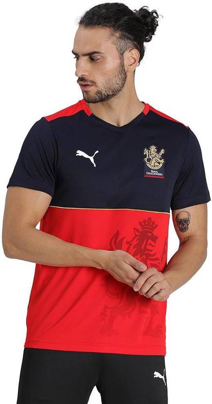 PRODUCT STORY: Embody the PLAY BOLD & CHALLENGER spirit owning the Royal Challengers Bangalore Men's Fan Jersey gritted with sport functionality , the fabric is calibrated with Moisture-absorbing dryCELL technology to keep you sweat-free & comfortable, .DETAILSFit Type- Regular fit Dual tone color jersey Pipping across the chest Royal Challengers Bangalore insignia V Neck Collar Flatlock stitching for anti-friction Short Sleeves Moisture-absorbing dryCELL technology PUMA Cat logo on the sleeve 100% Polyester