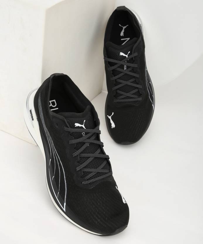 PRODUCT STORY: Maximum performance for any distance. The Deviate Nitro Men's Running Shoes is a cushioned silhouette that innovates the trend of max performance running shoes built to make running faster easier. The NITRO Foam and entire shoe are very light for the amount of responsive cushioning. Running economy is maximized via the carbon fibre propulsion INNOPLATE that acts as a lever to propel you forward with each stride. The DEVIATE NITRO improves efficiency for long runs, and is the perfect choice for max cushioning up to and including the marathon.FEATURES & BENEFITS NITRO Foam: PUMA's NITRO Foam technology offers the perfect balance between light weight and responsiveness INNOPLATE: PUMA's carbon fibre propulsion plate acts as a lever to propel you forward PUMAGRIP: PUMA's durable rubber compound that provides all-surface tractionDETAILS Low boot silhouette Breathable engineered mesh upper NITRO FOAM midsole PUMAGRIP RUBBER outsole for all-surface traction Carbon fibre INNOPLATE for energy transfer Lightweight, breathable tongue Lace closure for a snug fit TPU heel piece for stability Reflective branding and spoiler PUMA Formstrip on lateral side This shoe is ideal for road & indoor running.
