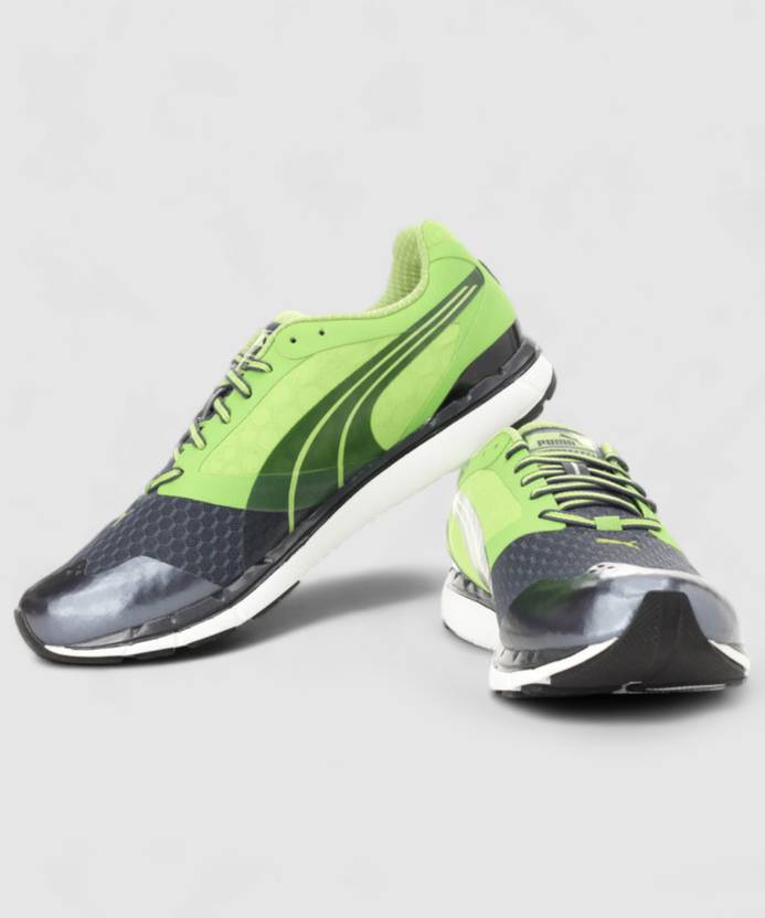Add a degree of sporty flair to your workout attire by donning these uber-cool running shoes from Puma that hold your attention with eye-catching hues of green, black and grey. Featuring a perforated top for better breathability and ventilation for your feet, these hardy running shoes invigorate hind-heel strength and provide plush padding to your feet as they come with a cushioned footbed and ankle.