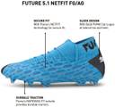 Product Story: Sleek and stylish, with long lines, cool colour combinations and a textured knit upper, the FUTURE 5.1's merge modern football fashion with forward-thinking innovation. Engineered to fit any foot shape, these performance boots allow for sharp turns and intricate movements on the pitch. With NETFIT technology and an ultra-lightweight, reactive outsole with studs that support play on firm natural surfaces and artificial grass, you'll be as agile as ever. Features & Benefits NETFIT: PUMAs innovative and customisable net lacing technology for multiple lacing options and optimal fit Details: Low boot silhouette One-piece engineered knit upper with NETFIT technology Ultra lightweight and reactive outsole with a combination of bladed and conical studs Lace closure for a snug fit Suitable for use on both firm natural surfaces and artificial grass PUMA Cat Logo at medial toe and heel FUTURE branding at heel
