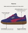 PRODUCT STORY : Straight from the archives, it’s the PUMA Palermo. This classic terrace shoe builds on PUMA’s heritage within football, while appealing to today’s sneakerheads and fashion mavens. This execution features a suede base and leather formstrip with foil printed PUMA branding.FEATURES & BENEFITS : PUMA’s leather products support responsible manufacturing via the Leather Working Group. www.leatherworkinggroup.com.DETAILS : Suede base,Leather formstrip and FOT,Suede tongue with debossed PUMA branded label and mesh backing,Foil printed PUMA branding on quarter panel flap,Screen printed PUMA branding on FOT,Synthetic leather lining.