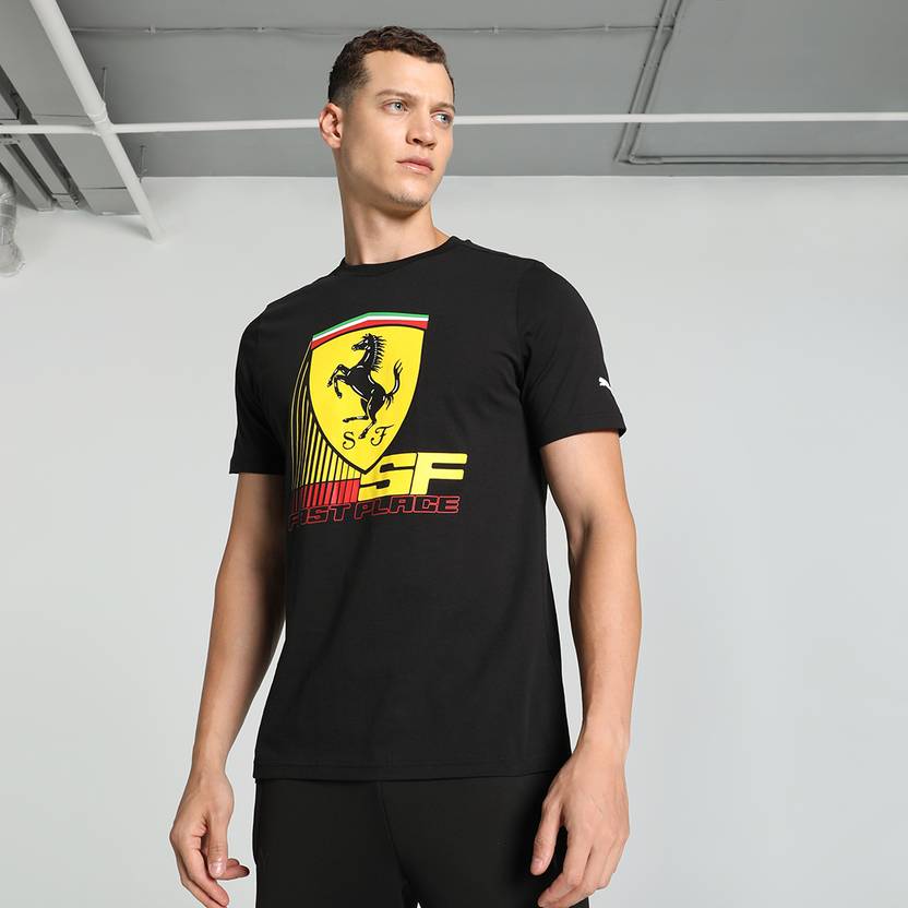 About PUMA x Scuderia Ferrari : In 2005, Scuderia Ferrari - the preeminent, time-honoured Formula 1 team - made a momentous decision to forge a partnership with the sports brand boasting the most storied heritage in motorsport - PUMA. Our collaboration is founded upon our shared racing pedigree and unrelenting drive to propel the sport to new heights. In addition to designing thrilling fanwear and street-ready collabs, we provide the team with state-of-the-art, meticulously engineered racewear, gloves, boots, and those legendary pre-race team uniforms. Product Story : Feel the need for speed with the Scuderia Ferrari tee featuring a big coloured Scuderia Ferrari shield print with the words "Fast Pace" on the chest. The regular fit and crewneck design make it easy to style with jeans or sweats. Details: Regular fit,Crewneck,Large printed tonal Scuderia Ferrari shield,PUMA Cat on the left sleeve,100% cotton.