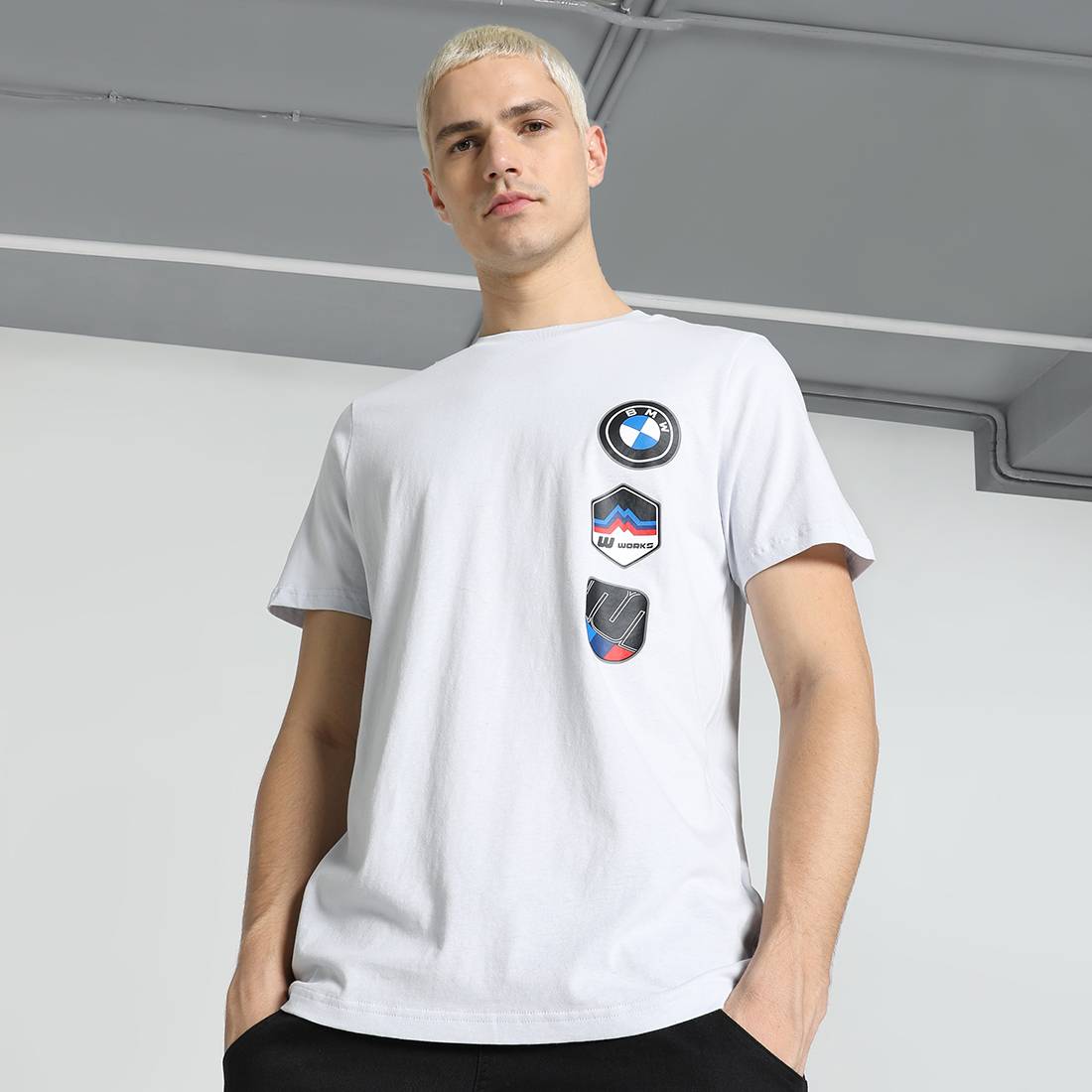 PRODUCT STORY : The crews heads off to summer. This BMW M Motorsport capsule is inspired by a desert rally and uses mini badges, dip dyes, modular designs, and utilitarian futuristic aesthetics to complete the aesthetic. This tee adorns all the hallmarks of the crew in addition to the signature logo of the marque. FEATURES & BENEFITS : Recycled content: Made with at least 20% recycled cotton. DETAILS : Relaxed fit,Crew neck,Short sleeves,BMW M Motorsport graphic on front,BMW M Motorsport graphic on back.