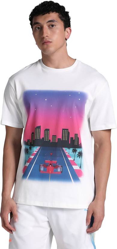 PRODUCT STORY : This capsule collection merges the vibrant, high-energy atmosphere of the Miami Grand Prix with the nostalgic allure of retro gaming. Inspired by the iconic Miami Vice aesthetic, the collection features pastel pop colours, rich prints, and pixelated 3D optics to create a dynamic, eye-catching look. FEATURES & BENEFITS : Made with at least 20% recycled materials. DETAILS : Relaxed fit Single jersey Regular length Crew neck Short sleeves Pixelated Cat print on the back Large Miami graphic print on the chest Scuderia Ferrari and PUMA Cat logo on the chest