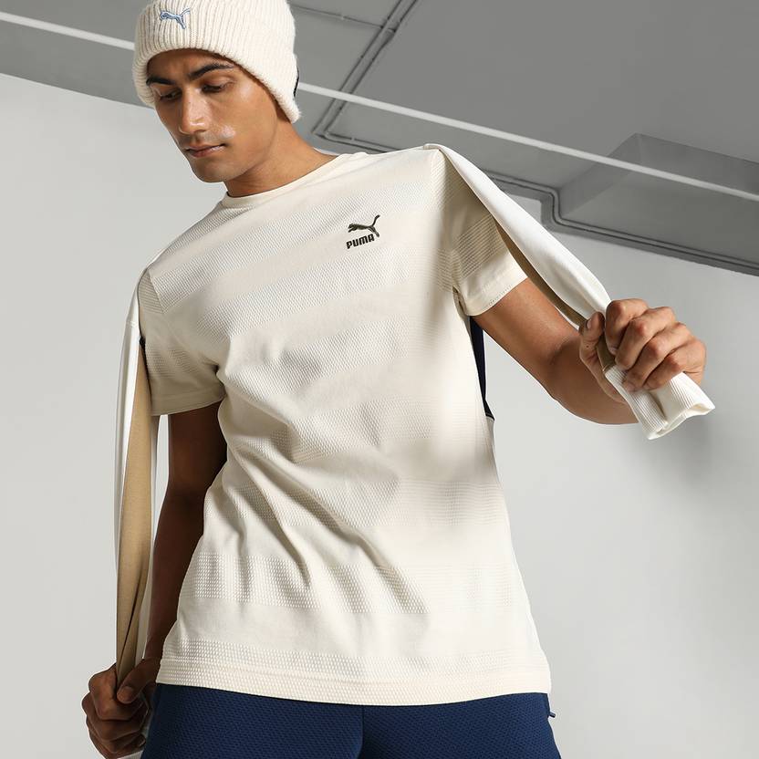 Product Story: The Classics Jacquard Men's T-shirt is a perfect fusion of comfort and style. Showcasing jacquard knit stripes, this T-shirt lends a sophisticated touch to your everyday casual wear. The breathable cotton fabric ensures ultimate comfort throughout the day, making it an ideal choice for lounging or casual outings. Details: Slim fit.Crew-neck.Jersey.PUMA Cat logo & wordmark at chest.Short sleeves.