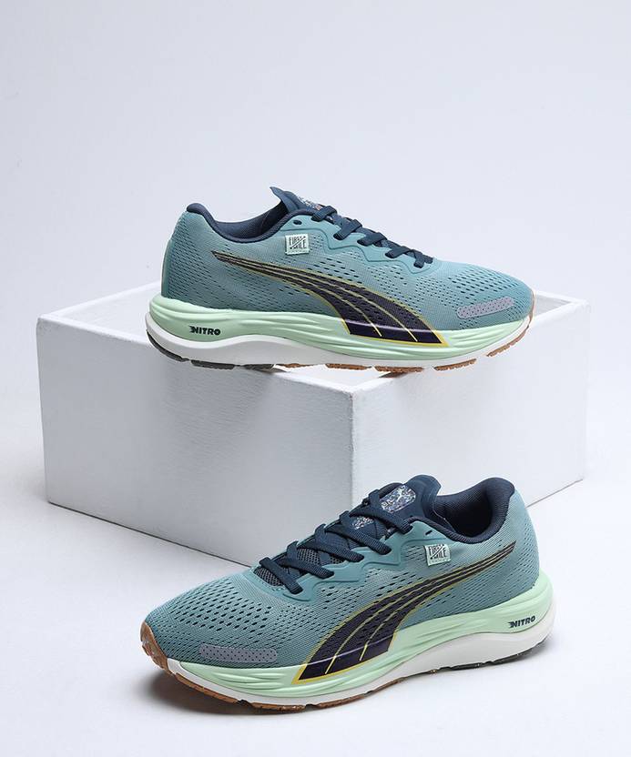 Product Story : An all-in-one neutral running shoe for any distance, the Velocity NITRO™ 2 is a lightweight and sleek update to the Run PUMA roster. Featuring NITROFOAM™ for exceptional responsiveness and ultimate cushioning, this upgrade to the original is a well-fitting and durable shoe for a smooth ride. PUMAGRIP offers multi-surface traction, from treadmill to track. The upper of this pair is made with First Mile® yarns that contain recycled post-consumer plastic. FEATURES & BENEFITS : NITRO™: Advanced nitrogen-injected foam designed to provide superior responsiveness and cushioning in a lightweight package.PUMAGRIP: Durable performance rubber compound designed for all-surface traction. DETAILS : Engineered mesh upper.Reflective design elements.Best for: Neutral pronators.Heel-to-toe drop: 10mm.Cushioning level: Medium.PUMA Formstrip on the lateral side.