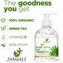 Pure Jangali Organics Aloe vera gel has healing and moisturizing properties and is best to provide the dry skin with the much needed hydration. Exfoliating the skin is important to get rid of dead cells and clear pores of grime. It an all-natural and gentle way to exfoliate your skin. Aloe vera is non-oily and penetrates the skin layers providing deep hydration from within and gives smooth, silky soft skin. It also lightens blemishes and scars.Aloe vera gel is a natural, multi-purpose product loved for its soothing, hydrating, and healing properties. Made from the pure extract of aloe vera leaves, this gel is rich in vitamins, enzymes, and antioxidants that nourish both skin and hair. Whether used as a moisturizer, a soothing after-sun treatment, or a hair conditioner, aloe vera gel delivers gentle care without clogging pores or leaving a greasy residue. It is suitable for all skin types, including sensitive and acne-prone skin. Aloe vera gel calms irritation, helps reduce acne, and hydrates dry patches, making it a go-to solution for everyday skincare.