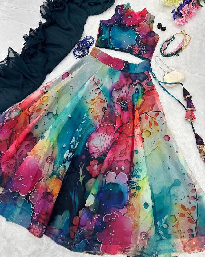 PuriMaa Floral Print Semi Stitched Lehenga Choli (Multicolor)